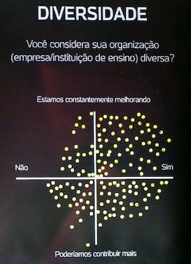 Distribuição de empresas e instituições de ensino que participaram do evento bem homogênea nos quadrantes do gráfico de diversidade. Empresas e instituições de ensino em diferentes estágios de evolução quanto à diversidade de suas organizações.