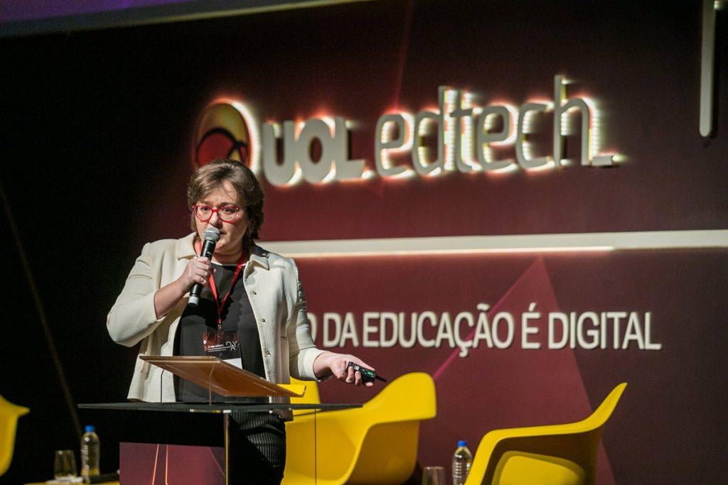 Betina von Staa da área de Acadêmicos e IE Digital do UOL EdTech falou sobre metodologias e abordagens em sua fast track, fazendo com que a plateia refletisse sobre o modelo tradicional de ensino.