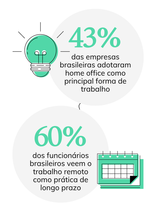 O home office se tornou o principal modelo de trabalho para 43% das empresas brasileiras. Ao mesmo tempo, temos cerca de 60% dos funcionários trabalhando de casa, em home office que, mesmo involuntário, veio para ficar.