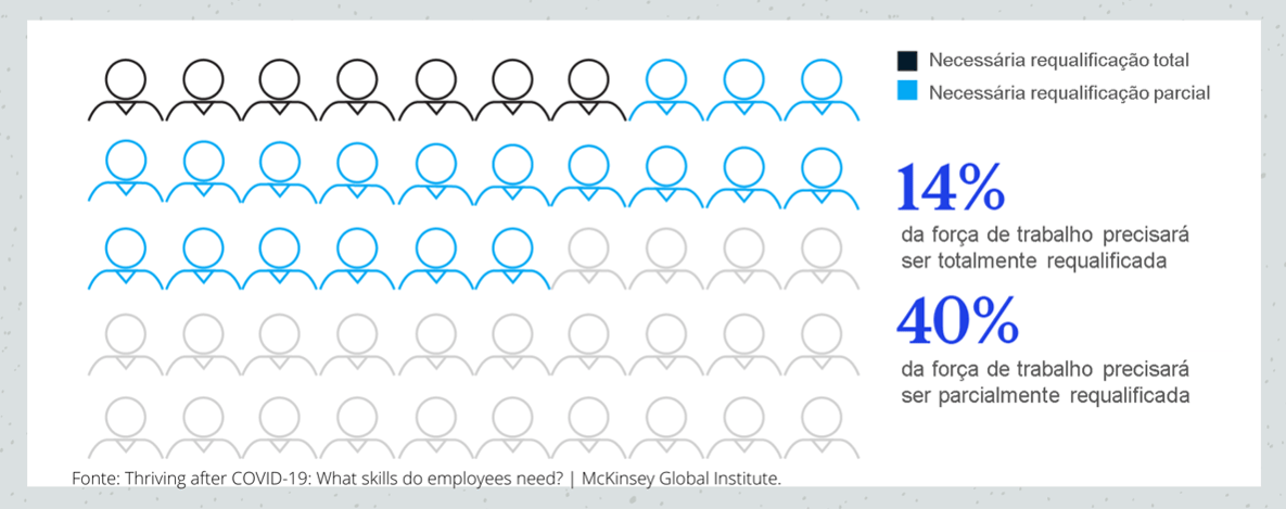 Veja que 14% dos colaboradores no mundo precisam requalificar (aprender novamente) TUDO o que sabem, conhecem e aplicam, enquanto 40% precisam requalificar apenas PARTE do que sabem, conhecem e aplicam. Os 46% restantes não precisam descartar nenhum conhecimento prévio, mas precisam URGENTEMENTE ressignificar TUDO o que sabem, conhecem e aplicam.